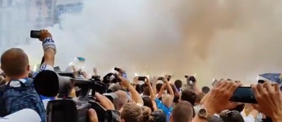 Ультрас украинских клубов провели пиротехнический перформанс на центральной площади Львова перед матчем за Суперкубок Украины между "Динамо" и "Шахтером".