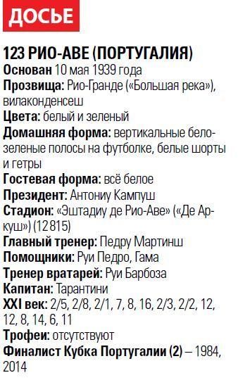 Сам же «Рио-Аве» – клуб очень скромный. В этом году «Рио-Аве» отметил свой 75-летний юбилей, и эти три четверти века клуб только и делает, что пробирается через тернии, но к звездам он лишь приблизился, а уровня их не достиг. Дважды играл в финале Кубка Португалии, но оба раза проиграл, в чемпионате выше пятого места не занимал, да и оно покорилось «Рио-Аве» только однажды, в 1982 году – в первом же сезоне после возвращения из второй лиги.