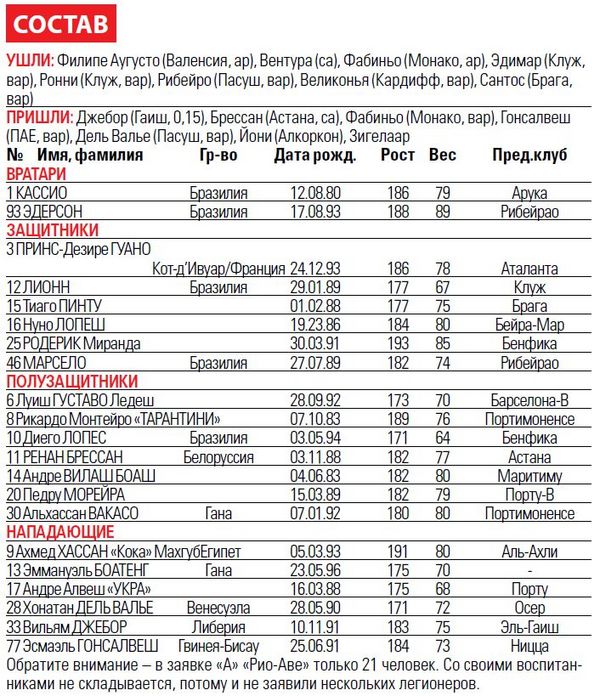 Первый выход в еврокубки для «Рио-Аве» не стал поводом к серьезным денежным тратам. Как и раньше, большинство новичков составили либо свободные агенты, либо игроки, вернувшиеся из аренды/взятые в аренду. За всё лето РАФК не продал ни одного игрока и только одного купил – нападающего Джебора, да и того за 170000. Но либериец пока и близко не пробился в основу.