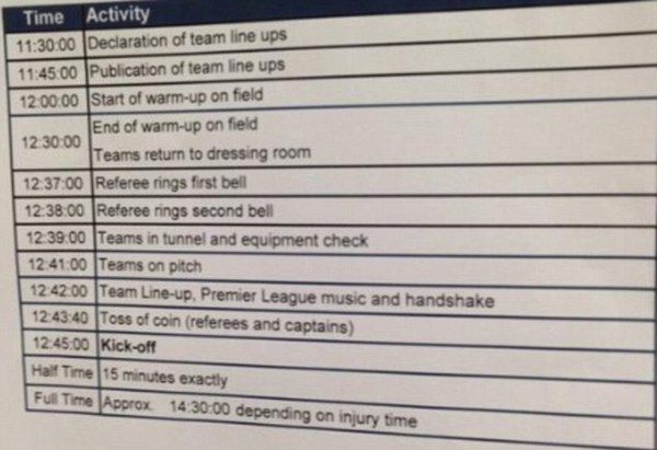 Пресса обнаружила у клуба документ, по которому становится ясно, что и в какое время должна делать команда АПЛ перед стартовым свистком.
