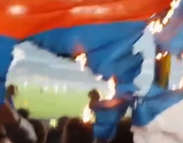 Во время центрального матча восьмого тура украинской Премьер – лиги между киевским «Динамо» и донецким «Шахтером» болельщики киевлян подожгли флаг Российской Федерации.