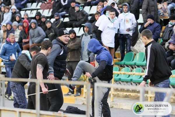 Згодом гості цілою громадою накинулися з кулаками на цих вболівальників, а коли ті падали на землю - добивали їх ногами.