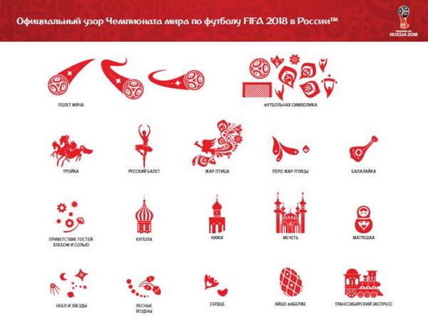 Узор будет состоять из следующих элементов - полет мяча, футбольная символика, тройка, русский балет, жар-птица, перо жар-птицы, балалайка, купола, приветствие гостей хлебом и солью, купола Кижи, мечеть, матрешка, небо и звезды, лесные ягоды, сердце, яйцо Фаберже и Транссибирский экспресс.