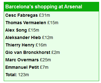 Британские журналисты уже успели подсчитать, что за счет продажи своих игроков только Барселоне Канониры "отбили" треть затраченных средств на строительство их нового стадиона (полная стоимость строительства Эмирейтс - 390 миллионов фунтов).