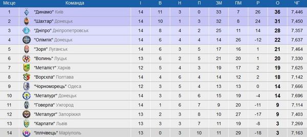 После 14-ти туров чемпионата Украины в премьер-лиге динамовцы под руководством Сергея Реброва набрали 36 очков. Отметим, что до победы над "Днепром" в 11-м туре нынешнего розыгрыша чемпионата "Динамо" не возглавляло турнирную таблицу с 7 апреля 2012 года. А "зимним" чемпионом в последний раз киевляне становились в 2011 году.