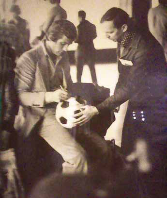 Молодой Леонид Карчемский берет автограф на мяче у чемпиона Европы-72, мира-74 (Евро-80 в будущем!), лидера гладбахской «Боруссии» Райнера Бонхофа. Киевскую гостиницу признаете?