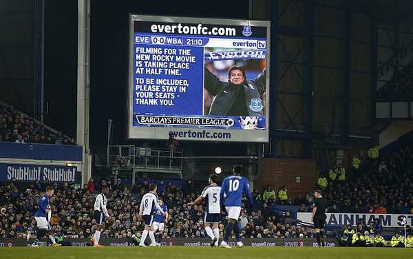 В минувший понедельник звезда фильма "Рокки" поприветствовал болельщиков с экрана "Гудисон Парка" перед началом матча между "Эвертоном" и "Вест Бромвичем". Оказалось, что Сталлоне прямо во время игры снимал седьмую часть фильма о Рокки Бальбоа, которая носит название "Крид".