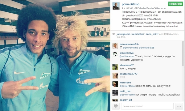 Полузащитник сборной Украины и питерского «Зенита» Анатолий Тимощук разместил в своем инстаграме фото с одноклубником Акселем Витселем.