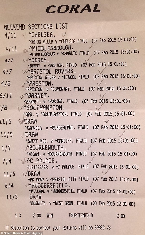 48-летний болельщик угадал исходы сразу 14 поединков, поставив всего два фунта. Итоговый выигрыш Дина составил 69 тысяч фунтов, а еще 23 тысячи были начислены в качестве бонусов.Теперь счастливый фанат собирается вложить эти деньги в покупку нового особняка для своей семьи.
