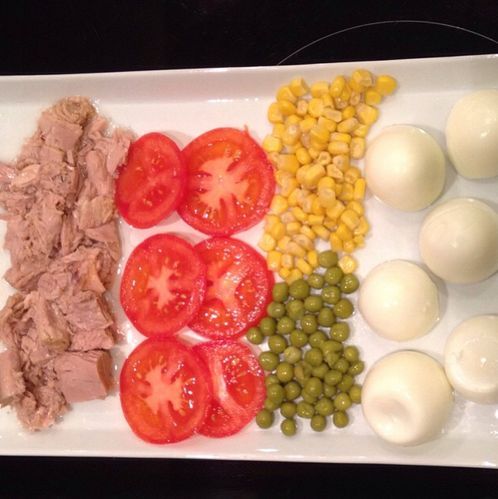 Если убрать помидоры, горох и кукурузу за скобки, а добавить сельдерей, петрушку, немного маёнеза и зеленый лук, то получится неплохой салат из тунца :) Ну а горох с кукурузой лучше вообще не есть.