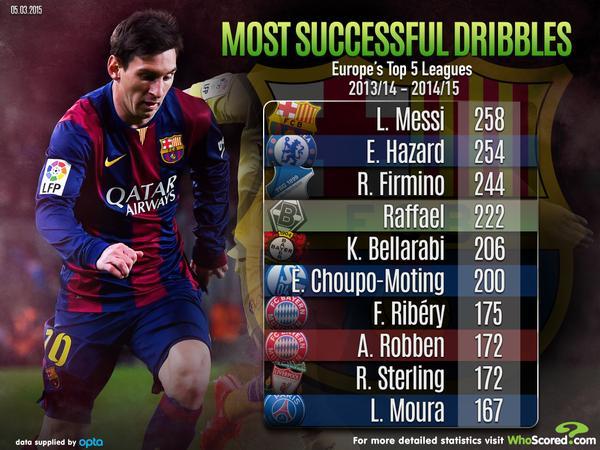 Его ожидаемо возглавил Лионель Месси из "Барселоны" с 258 успешными попытками дриблинга. Примечательно, что в четверку лучших вошел бразилец Раффаэл из гладбахской "Боруссии" еще недавно выступавший за киевское "Динамо".