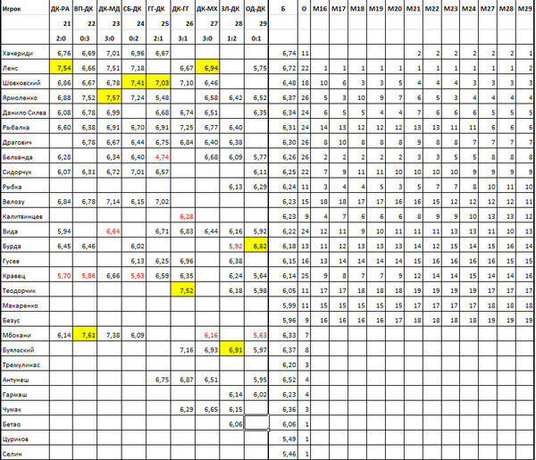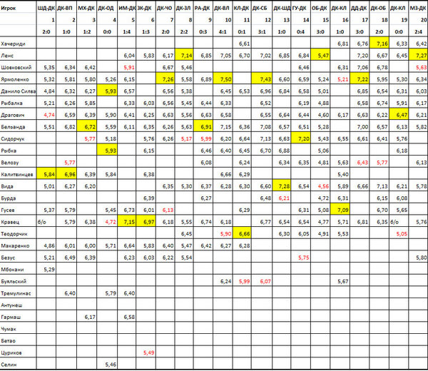 Продолжаем пристально следить за кандидатами на попадание в рейтинг. Всего в двух шагах от этого находится Буяльский. Со средним баллом 6,37 он будет претендовать сразу на 5-ю позицию. Чуть побольше надо сыграть Мбокани, но его средний балл также весьма высок - 6,33. А вот Антунешу, Гармашу и Чумаку еще играть и играть!