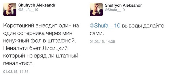 Зрештою, уже цьогоріч після матчу із запорізьким «Металургом» на твіттер-сторінці Олександра Шуфрича з’явились два такі повідомлення: