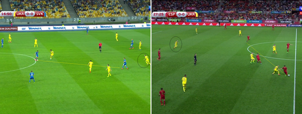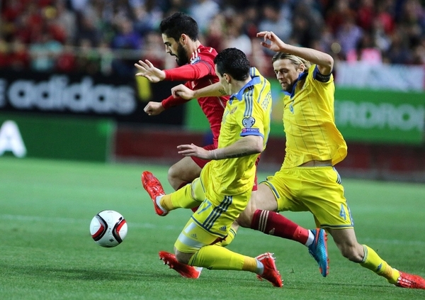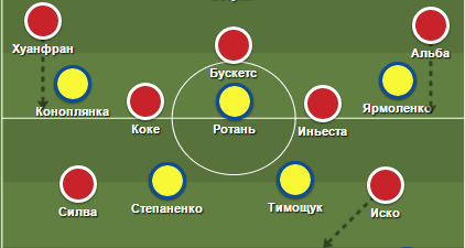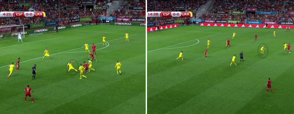 Большой проблемой стали смещения Иско с левого фланга в центр. Таким образом Испания создавала численное преимущество в центре поля, а один из их полузащитников постоянно оказывался между линиями обороны и полузащиты сборной Украины.