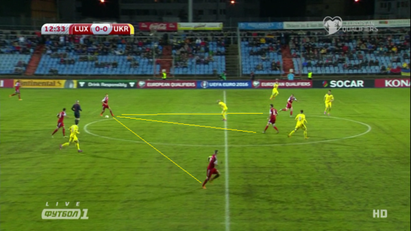Еще ярче проблемы в опорной зоне сборной проявились, как ни странно, в первом тайме против Люксембурга. Тогда в паре с Тимощуком играл Сидорчук, который гораздо активнее Степаненко подключается к атакам, и Анатолий часто оказывался один против выходящих в контратаку соперников. В моменте, когда Люксембург мог в первый раз открыть счет в матче, Тимощук физически не мог перекрыть все направления передач соперника. Кого-либо еще из центральных полузащитников в этот момент в кадре нет.