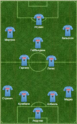 "Наполи": Андухар, Стринич, Кальехон, Игуаин (Инсинье 76), Маджо, Мертенс (Суньига 82), Лопес Сильва, Габбьядини (Гамшик 64), Кулибали, Албиоль, Гаргано