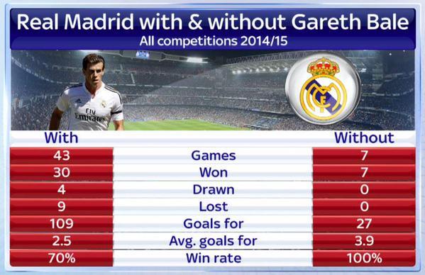Статистика гласит – с Бэйлом Реал выиграл только 70% матчей во всех турнирах, без валлийца у Сливочных 100-процентные показатели, причем отсутствие экс-полузащитника Тоттехэма положительно сказывается и на результативности команды Карло Анчелотти.