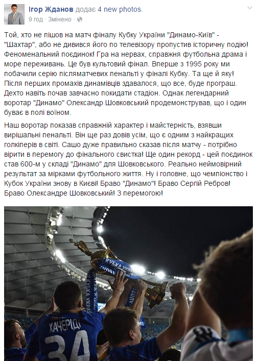 Министр спорта Украины Игорь Жданов поздравил киевское «Динамо» с победой на своей странице в facebook. В его словах чувствовался восторг от увиденного. Игорь Жданов отметил Александра Шовковского назвав его одним из лучших голкиперов во всем мире. По его словам, многие на стадионе перестали верить в успех киевлян после первых промахов динамовцев, многие, но не все, а главное сам Александр Шовковский до последнего верил, что даже в столь сложной ситуации стоит бороться до последнего и показал всей Украине, что и один в поле воин.