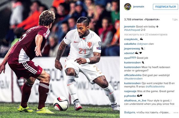 Полузащитник "Динамо" и сборной Голландии Джермейн Ленс поделился в Instagram фото после победы над сборной Латвии 2:0.