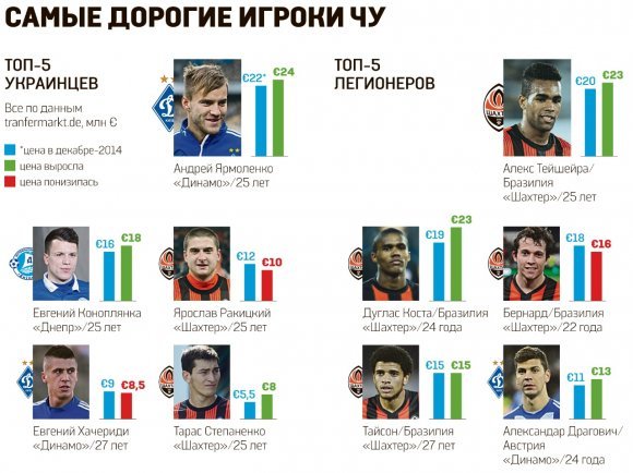А вообще, наших футболистов, чья ориентировочная цена — миллион и выше, теперь 64. У большинства из них цена идет в рост, хотя, к примеру, страдающие от травм Чигринский и Мандзюк к миллиону опустились (напомним, в 2009-м Чигринский обошелся «Барсе» в 25 млн евро).