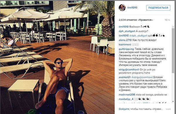Форвард "Хайдука" Артем Милевский опубликовал в Instagram фото, на котором он отдыхает в "Рэдиссоне" в Сплите.