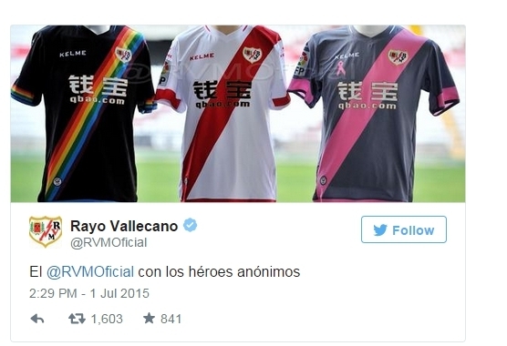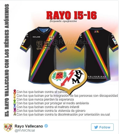 Но вместе цвета радуги символизируют борьбу против гомофобии. Заметим, что на этой неделе в Мадриде состоялся гей фестиваль. «Райо Вальекано» имеет репутацию как один из наиболее прогрессивных и социально сознательных футбольных клубов в мире.