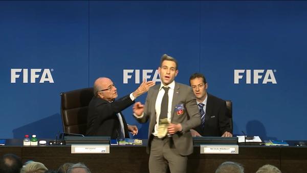 Британский комик Ли Нельсон закидал банкнтонами главу ФИФА Йозефа Блаттера на пресс-конференции ФИФА.
