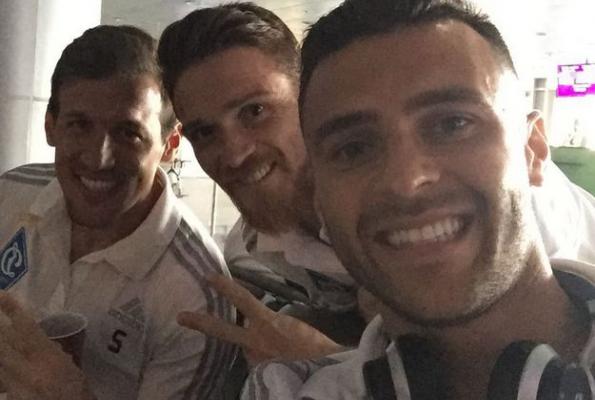 Нападающий киевского "Динамо" Жуниор Мораес сделал совместное фото со своими одноклубниками Данило Силвой и Виторину Антунешем из бориспольского аэропорта, откуда "бело-синие" отправятся на завтрашний выездной матч с "Днепром".