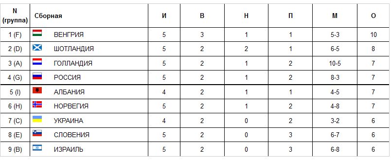 Итак, именно следующим образом на сегодня выглядит сводная таблица сборных, идущих третьими. В ней, уточняю, не учитывается добыча, завоеванная в играх с «шестыми», так как в группе I всего пять команд. Наши здесь – пока внизу, однако имеют поединок в запасе.