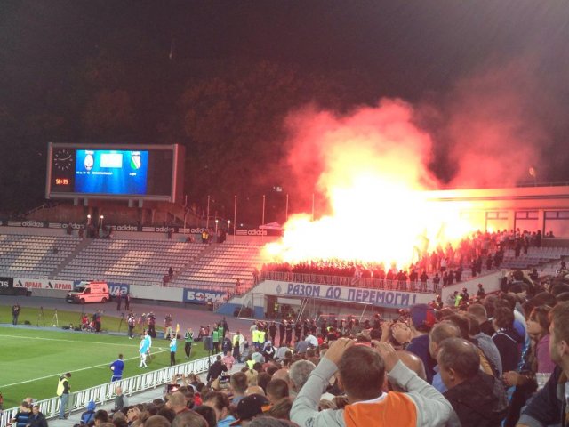 Фотографию того, как ультрас польского клуба поддерживают своих любимцев в Киеве, опубликовал в твиттере журналист Константин Андриюк.