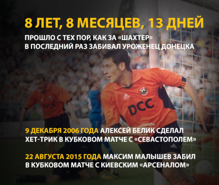 Вчерашний гол Максима Малышева в кубковом матче с киевским «Арсеналом» (3:0) прервал серию, затянувшуюся почти на десятилетие – впервые за почти 9 лет гол за «Шахтер» забил уроженец Донецка. Этот гол стал для него первым в официальных матчах за горняков.