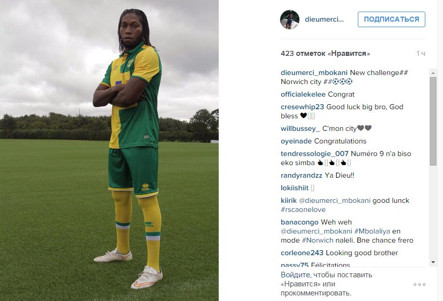 Форвард "Динамо" Дьемерси Мбокани, который до конца этого сезона на правах аренды будет защищать цвета английского "Норвича", поделился в Instagram фото в футболке своего нового клуба.