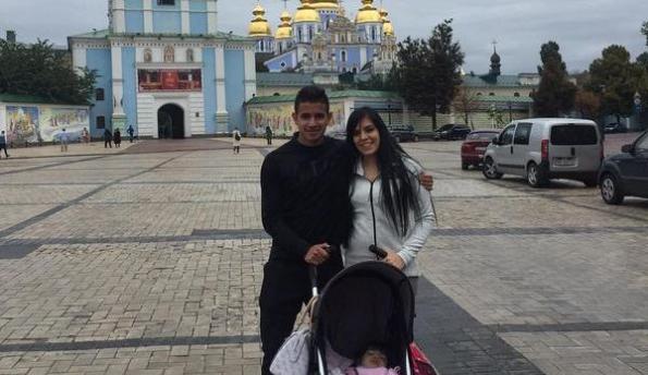Вингер киевского "Динамо" Дерлис Гонсалес вместе с женой и ребенком прогулялся по Софиевской площади и сделал фото напротив местного собора.