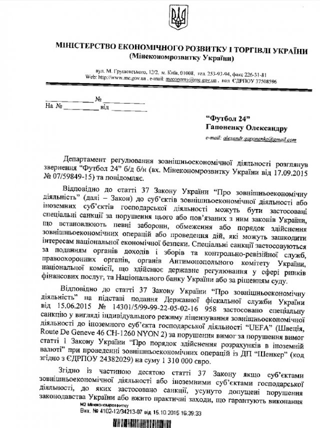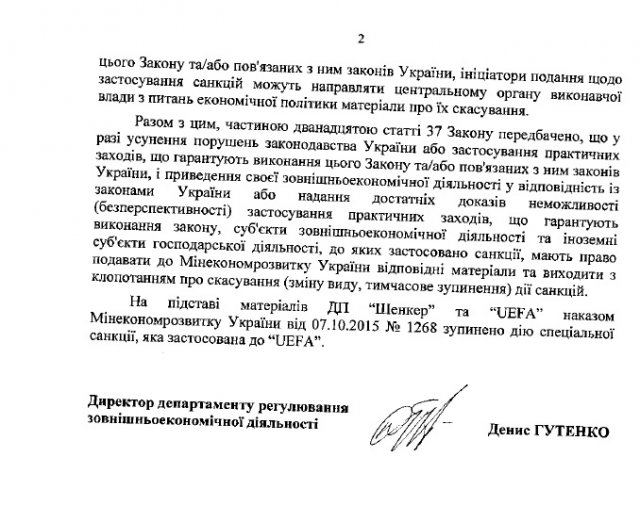 "На основании материалов ДП "Шенкер "и" UEFA "приказом Минэкономразвития Украины от 07.10.2015 №1268 приостановлено действие специальной санкции, примененной к "UEFA", - говорится в ответе Департамента регулирования внешнеэкономической деятельности.