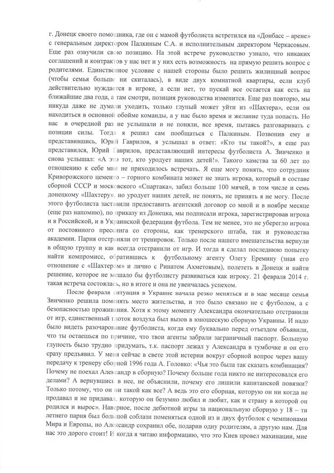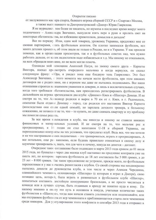 Вчора у «Профутболі» Ігор Циганик проанонсував відкритий лист на адресу програми від Юрія Гаврилова – агента дебютанта збірної України Олександра Зінченка. Ми пообіцяли викласти повну версію листа у соціальні мережі. Ми не приймаємо нічиєї позиції, просто надаємо слово одній із сторін – учасників конфлікту і подаємо лист у такому вигляді, в якому він надійшов на нашу електронну скриньку.