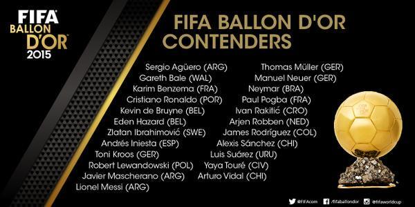 ФИФА на своем официальном сайте опубликовала список из 23-х претендентов на "Золотой мяч"-2015.