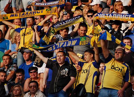 Фанатов из Харькова поддержали киевские болельщики. Фан-сектор "Динамо" кричал "Курченко", болельщики "Металлиста" отвечали "П...р!"