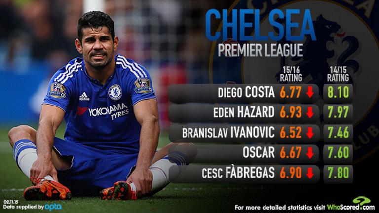 Старт карьеры испанского форварда бразильского происхождения на Туманном Альбионе получился впечатляющим. Диего Коста забил десять голов в девяти поединках, в среднем за матч наносил 3.1 ударов и отдавал две ключевых передачи (последний пас, после которого партнер по команде наносит удар). В нынешнем сезоне он отличился всего лишь два раза, наносит в среднем 1.8 ударов и отдает 1.1 обостряющих передач.