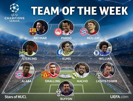Джанлуиджи Буффон («Ювентус»), Давид Алаба («Бавария»), Крис Смоллинг («Манчестер Юнайтед»), Начо Фернандес («Реал»), Штефан Лихтштайнер («Ювентус»), Свен Кумс («Гент»), Виллиан («Челси»), Рахим Стерлинг («Манчестер Сити»), Неймар («Барселона»), Томас Мюллер («Бавария») и Фелипе Пардо («Олимпиакос»)