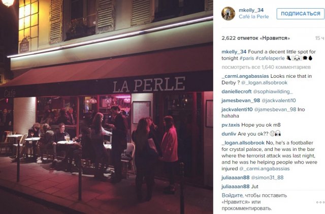 Как сообщает Eurosport, в соцсетях возникали сообщения, что ресторан "La Perle" также подвергся атаке, но они не подтвердились. Однако ночью в твиттере появились снимки Келли, сидящего рядом с ранеными и полицейскими. Как выяснилось впоследствии, Келли помогал раненым во время теракта.