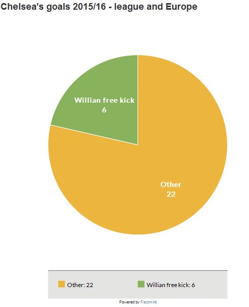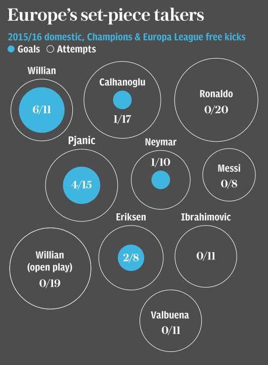 Как сообщает Telegraph Football, исходя из статистических данных, полузащитник "Челси" на данный момент является лучшим исполнителем штрафных ударов в Европе, а Криштиану Роналду - худший. Бразилец забил 6 раз из 11-ти попыток, а португалец - 2 раза из 75-ти попыток.