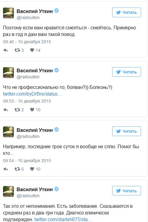 Известный комментатор Василий Уткин извинился за свои комментарии в матче 6-го тура Лиги чемпионов "Байер" – "Барселона". Журналист путал фамилии игроков и названия команд. Например, Хилберта назвал Шатовым, а Тер Штегена – вратарем ЦСКА, называл "Барселону" "Зенитом", также упоминал "Спартак" и "Ростов" вместо команд на поле. Уткин объясняет свои ошибки тем, что он не спал несколько дней и у него клинически подтвержденная бессонница.