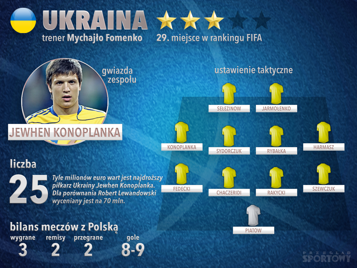 Тренера, который преподал нам эти уроки, зовут Михаил Фоменко, и он до сих пор возглавляет сборную Украины. Опытный (67 лет) наставник предпочитает оборонительный футбол с упором на «физику», из-за чего часто подвергается критике. Тем не менее, его оружие работает. Под руководством Фоменко сборная Украины одержала 20 побед, 6 раз сыграла вничью и потерпела всего 4 поражения. Украинцам не хватило совсем чуть-чуть, чтобы пройти на Евро напрямую, но в плей-офф они доказали свою силу, победив сборную Словении (2:0, 1:1). Это первый успешный плей-офф в истории «желто-синей» команды (...) После выхода в финальную часть болельщики уже очень рады и не требуют от своей команды запредельных результатов. (...) Конечно, на футбол в Украине повлияла и политическая ситуация. Лучший клуб, донецкий «Шахтер», вынужден был покинуть Донецк и теперь играет преимущественно во Львове. Многие клубы столкнулись с финансовыми проблемами, игроки уезжают за рубеж. Тем важнее для украинцев выступления их национальной команды». А вот как Przeglad Sportowy видит расстановку сборной Украины и ее главную «гвязду»: