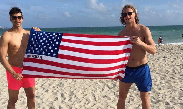 "Пляж Майами", - подписал снимок австриец, на котором он вместе со своим товарищем держит американский флаг.