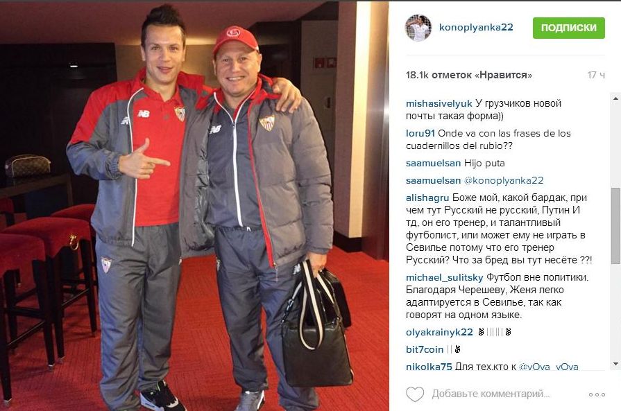 Полузащитник "Севильи" Евгений Коноплянка в Инстаграм опубликовал фото с одним из тренеров испанского клуба Дмитрием Черышевым.