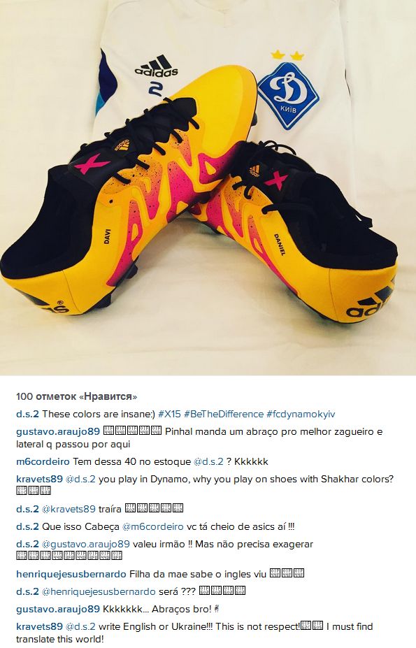 Артем на английском языке оставил следующий комментарий к фото: "Ты же играешь за "Динамо", почему у тебя бутсы цветов "Шахтера"?