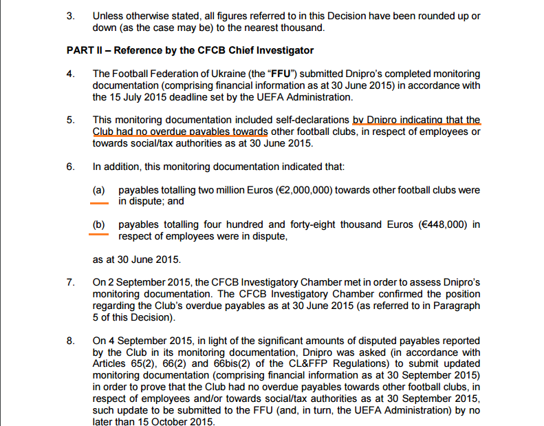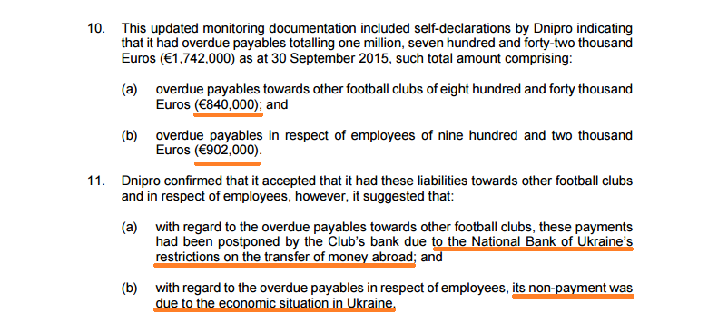 Итак, интересуясь финансовым состоянием футбольного клуба "Днепр", УЕФА не получил внятного объяснения о наличии или, наоборот, отсутствии у клуба долгов. ФФУ, отвечая на запрос УЕФА, предоставила контролирующему органу неоднозначную информацию. В отчетности, предоставленной Федерации футбола Украины днепропетровским клубом (позже перенаправленноей в УЕФА), отмечалось, что по состоянию на 30-е июня 2015-го года "Днепр" не имеет никаких долгов перед другими футбольными клубами, работниками клуба, социальными или налоговыми органами. Впрочем, в то же время отмечалось, что "Днепр" не согласен с долгом в размере 2 миллионов евро перед другими клубами, а также с долгом в размере 448 000 евро перед работниками клуба.