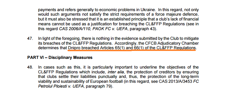 "Днепр" нарушил статью 65 (1) и 66 (1) Положения УЕФА по лицензированию клубов и финансовому Fair Play.
