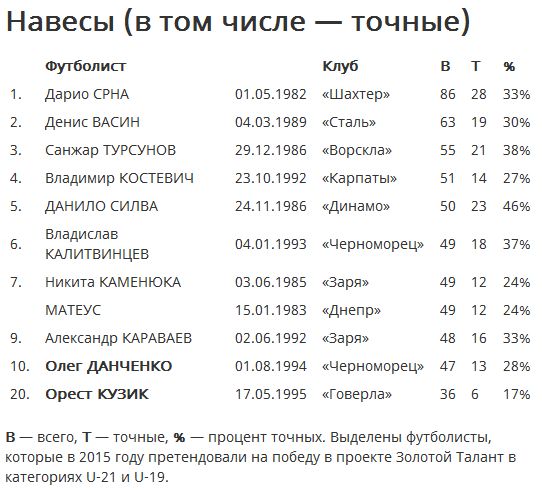В этом рейтинге, составленном аналитической компанией InStat Football, в первую очередь учитывается общее количество навесов. Впрочем, лидер списка — капитан «Шахтера» Дарио Срна — и по количеству точных навесов тоже занимает 1-е место. Если же говорить об эффективности, то здесь №1 из числа наиболее регулярно делающих навесы — Данило Силва из «Динамо», у которого практически каждая верховая подача с фланга находит адресата.
