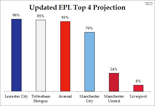 Система учитывает положение в таблице, качество моментов команд в уже сыгранных матчах и календарь на концовку сезона, после чего цифры адаптируются на историю выступлений команды в последние сезоны и зарплатную ведомость. Результаты вполне совпадают с субъективным восприятием – «Сити» все еще явный фаворит, но внезапно все стало намного интереснее.